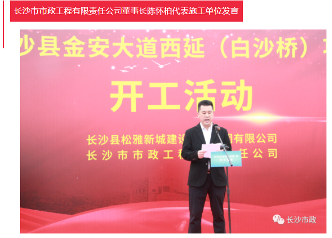 陳懷柏代表長沙市政衷心感謝各級領導的支持和信任。他表示,長沙市政將以高度的責任感和歷史使命感,運用全新的管理理念,發(fā)揚“攻堅克難、開拓創(chuàng)新”的市政精神,秉承長沙市政的“三個一法則”:從第一道工序起抓質量,從第一個工作日起抓進度,從每一個細節(jié)處抓安全文明施工。保質、保量、按期完成項目建設,著力打造精品工程、優(yōu)質工程,致力金安大道建設,助力長沙縣大城崛起!