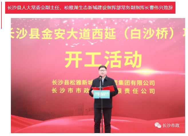 曹偉興表示,金安大道西延(含白沙河橋)項目作為松雅湖生態(tài)新城“三縱三橫”中的重要基礎設施項目,連接長沙縣、開福區(qū)兩地,串聯望城經開區(qū)、開福金霞片區(qū)、長沙縣松雅湖生態(tài)新城三個區(qū)域,是長沙縣融入主城區(qū)的重要通道,更是長沙市實施大北城開發(fā)的重要通道,項目建成意義重大,影響深遠。希望建設方堅持人民至上、生命至上、質量至上的理念,牢牢守住安全生產的底線和紅線,精心組織、精心管理、精心施工,將項目打造成為“精品工程”、“百年工程”。