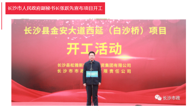 4月19日上午,長沙縣金安大道(含白沙河橋)西延項目開工活動隆重舉行。長沙市人民政府副秘書長張躍先,長沙縣委副書記、縣長、松雅湖生態(tài)新城建設指揮部指揮長陳永高,松雅湖生態(tài)新城建設指揮部常務副指揮長曹偉興,長沙市市政工程有限責任公司董事長陳懷柏出席活動。長沙縣松雅湖生態(tài)新城發(fā)展中心書記羅衛(wèi)滋主持開工活動。